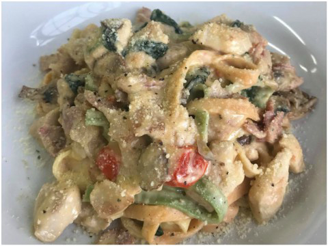 | (Chicken, Cherry Tomatoes, Spinach, Mushrooms, Fettuccine Pasta, Creamy Sauce) |